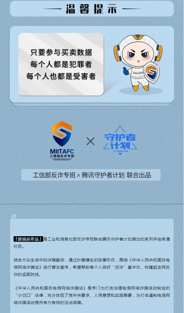 「漫說反詐法」是工業(yè)和信息化部反詐專班聯(lián)合騰訊守護者計劃推出的系列手繪條漫欄目。
