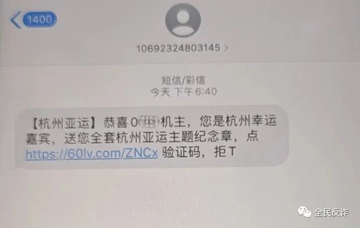 近日,朱女士回家路上,接到一個(gè)電話,對方那頭傳來溫柔磁性的男聲提醒她,說有一條短信記得查收,朱女士點(diǎn)開一看,短信顯示:“【杭州亞運(yùn)】恭喜****機(jī)主,您是杭州幸運(yùn)嘉賓,送您全套杭州亞運(yùn)主題紀(jì)念章,點(diǎn)http://60lv.com/ZNCx驗(yàn)證碼,拒T ”。