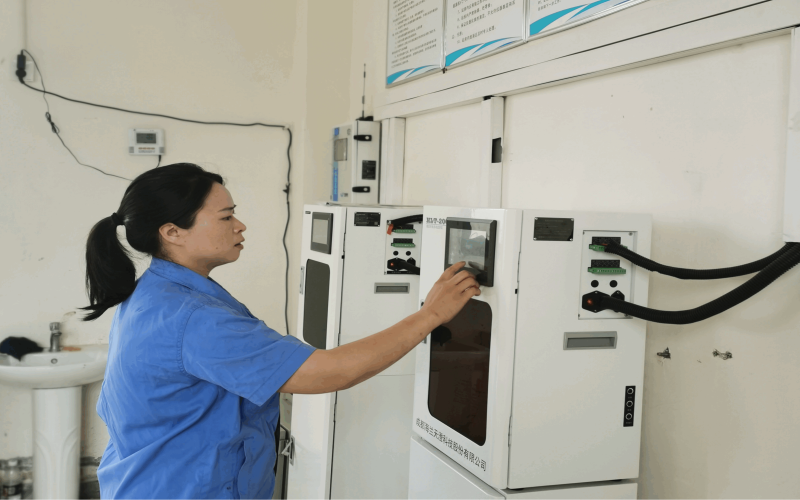 為了確保各個(gè)環(huán)節(jié)污水檢測(cè)指標(biāo)正常,李紅每隔2小時(shí)就對(duì)進(jìn)出口在線監(jiān)測(cè)室的在線設(shè)備、各類(lèi)藥劑進(jìn)行巡視,查看數(shù)據(jù)是否上傳成功,及時(shí)處理應(yīng)急突發(fā)問(wèn)題。水廠占地達(dá)130畝,一遍巡視下來(lái)就會(huì)花上1小時(shí)左右。當(dāng)進(jìn)口取樣管堵塞時(shí),她帶領(lǐng)班組成員積極協(xié)助維修科等工作人員對(duì)取樣設(shè)備進(jìn)行清理。為了減少進(jìn)口監(jiān)測(cè)設(shè)備吸到雜質(zhì)堵塞檢測(cè)設(shè)備的管路,她每隔1-2小時(shí)還要對(duì)進(jìn)水取樣口篩網(wǎng)進(jìn)行沖洗,從來(lái)不怕臟、不怕累。